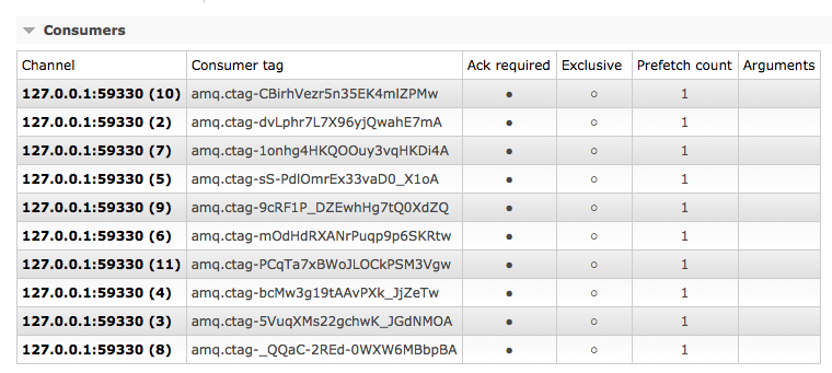 channel.basicConsume(QUEUE_NAME, false, consumer);因此,对于每个使用者,我创建了一个新的通道,这是由日志确认的: