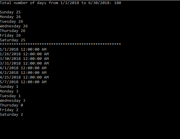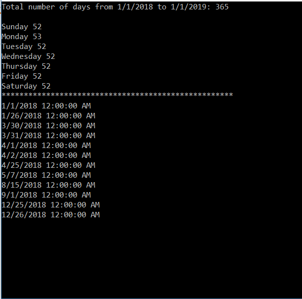 DisplayDayInfo(new DateTime(2018, 01, 01), new DateTime(2019, 01, 01));