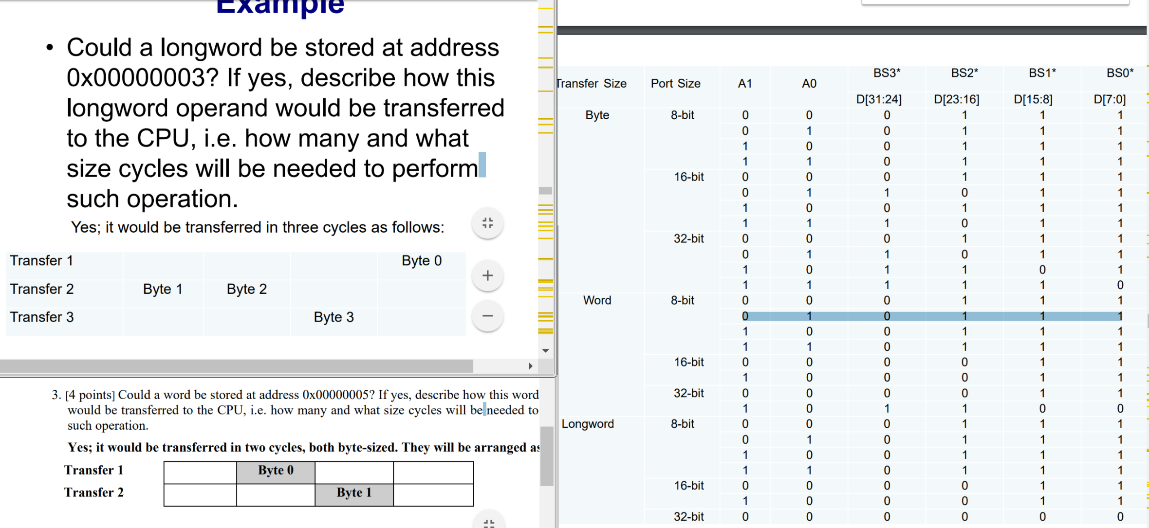 让我们考虑一下您所附加的图像中的示例。如何通过32位内存端口存储地址0x0000003的长字?关注端口大小为32位的行。我们有A1:0 = 11,所以首先必须用BS3 3:0= 1110执行单字节传输。其他三个字节需要传输到位置0x0000004 (A1:0 = 00)、0x0000005 (A1:0 = 01)和0x0000006 (A1:0 = 10)。这可以使用三次单字节传输(需要三个周期),或者使用一次两字节传输,然后是一次单字节传输(需要两个周期)。