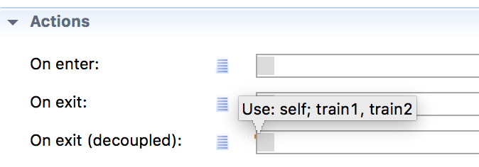 在列车解耦元素的on (解耦)操作中,您可以使用两个变量: train1和train2,其中train1是通过第一个端口退出的原始列车,train2是通过另一个端口退出的解耦列车。由于train1保存了有关火车的原始信息,因此对于要复制的每个变量,您必须执行以下操作: