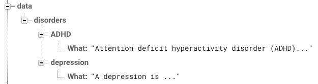 { "disorders": { "ADHD": { "what": "ADHD is ...", "signs": "The main symptoms of ADHD are ...", "types": "There are three different ..." } "autisme": { "what": "Autism ..." } "..." } }