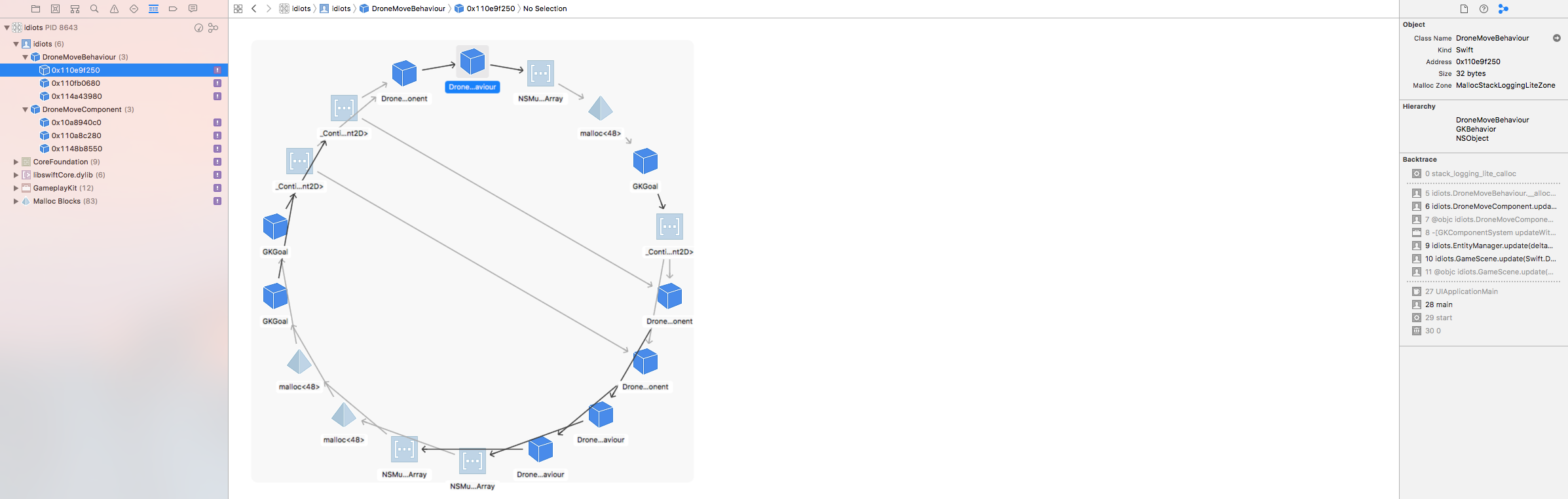 我使用的是GKAgents、GKGoals和GKBehaviours,但是我的行为和组件之间的内存被泄露了。我认为图像和代码可以更好地解释我的问题:
