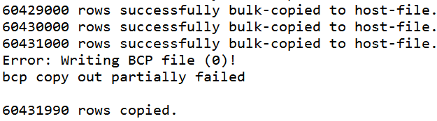 源表获得了大约1.32亿条记录,bcp将大约6000万条记录复制到.txt文件中,然后失败,错误如下: