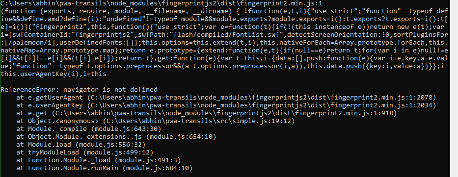我试图通过fingerprintjs2获取浏览器指纹,这是Javascript中的一个npm模块。但它给了我以下错误:-