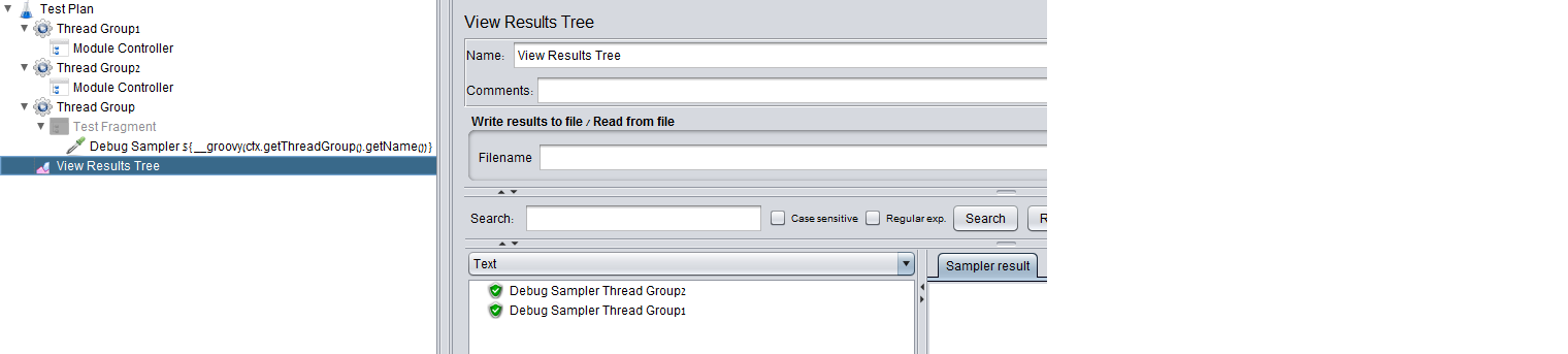 如何在使用相同的测试片段采样器的情况下,配置j测量仪以生成每个线程组的测试结果?就像这样