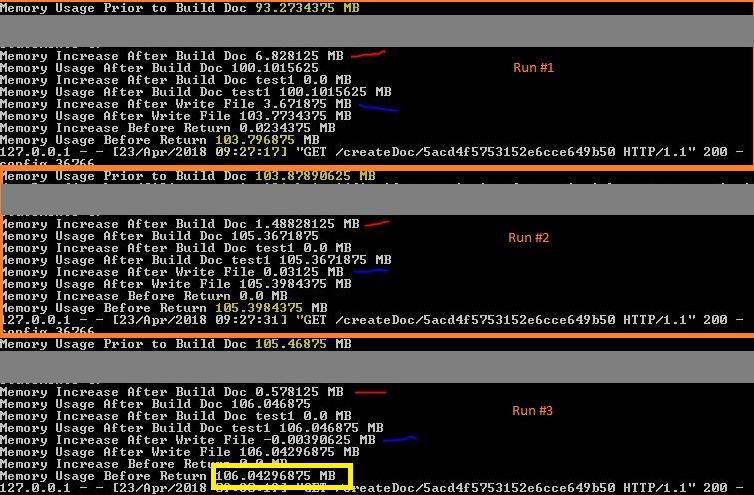 关注的是,每个顺序的API调用似乎都是从上次调用离开内存使用量并继续添加的位置开始的。应用程序以93 it启动(见黄色高亮显示),但在第一次调用结束后,它以103.79MB结束,第二个调用以103.87MB开始,最后一个调用以105.39MB结束,第三个调用以105.46Mb开始,最后一个以106MB结束。虽然使用量在减少,但在100次调用之后,我仍然看到了内存的增量使用。红线和蓝线显示API调用期间各个点的内存变化。红线在文档生成之后,蓝线在S3上传之后。