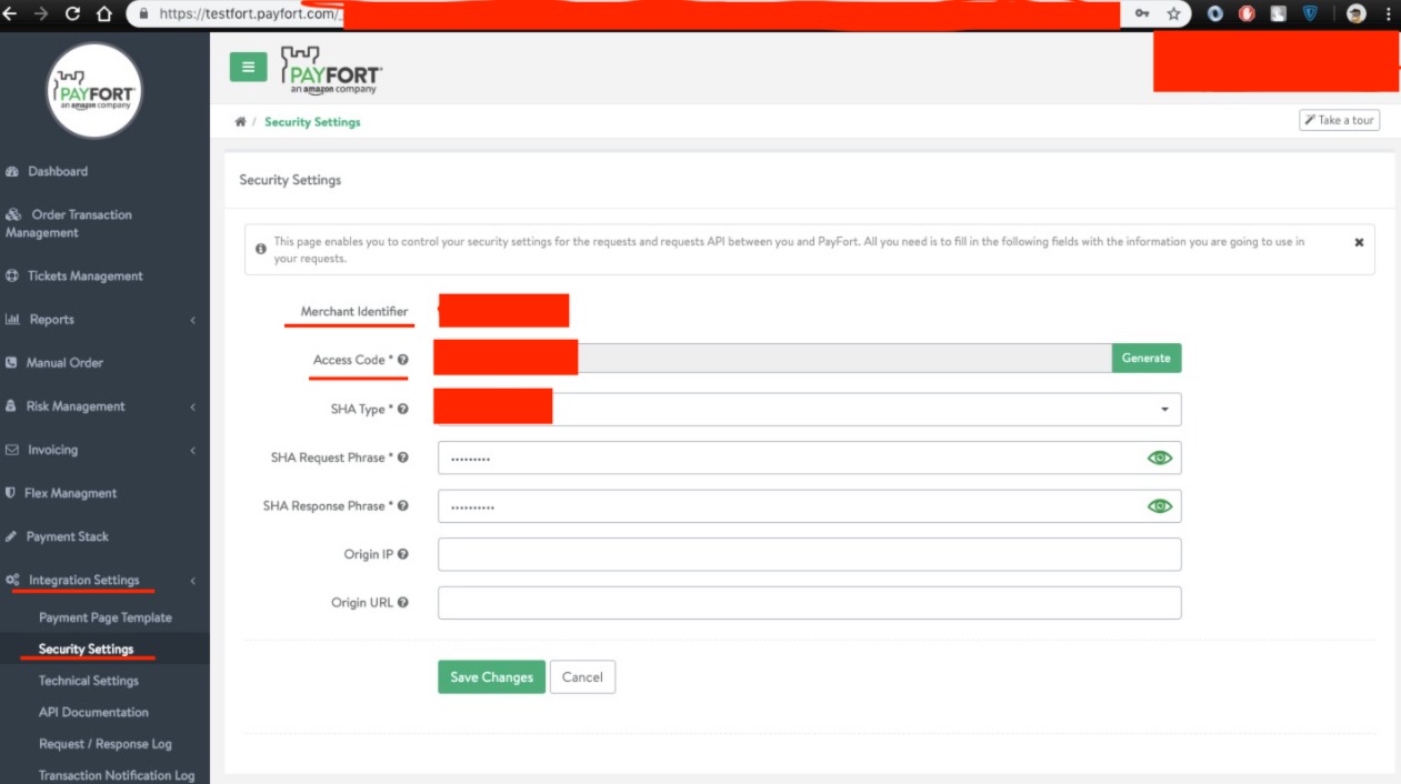 您可以在https://testfort.payfort.com上登录您的测试帐户,并从"Integeration“菜单和”安全设置“选项中找到您的访问代码和商家标识符。您还可以看到附加的图像。