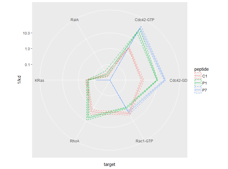 r <- r + geom_polygon(aes(group = peptide, colour = peptide), fill = NA, show.legend = F)