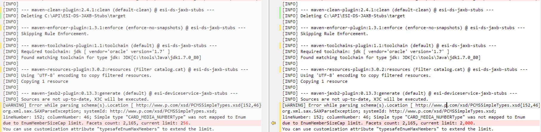 这显示了JDK和JDK 8运行之间的区别。在左边,它似乎忽略了binding.xjc文件,因此不知道枚举的大小。