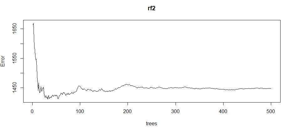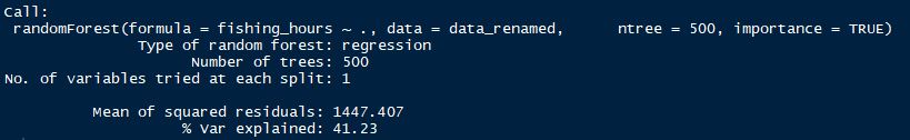 rf3 <-randomForest(fishing_hours ~ . , data = data_fish, ntree = 1000, importance=TRUE, do.trace=100)尝试使用rf3$err.rate[,1]访问OOB错误率时,当结果或NAs列出时,我将获得NULL,并绘制rf3如下所示: