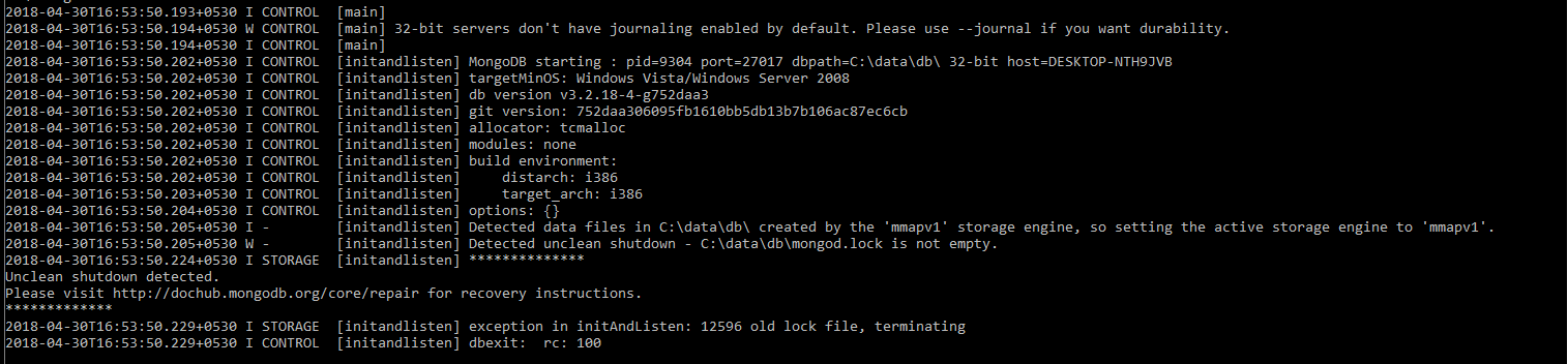 在错误消息中,它说“检测到不干净的关机. mongod.lock不是空的”