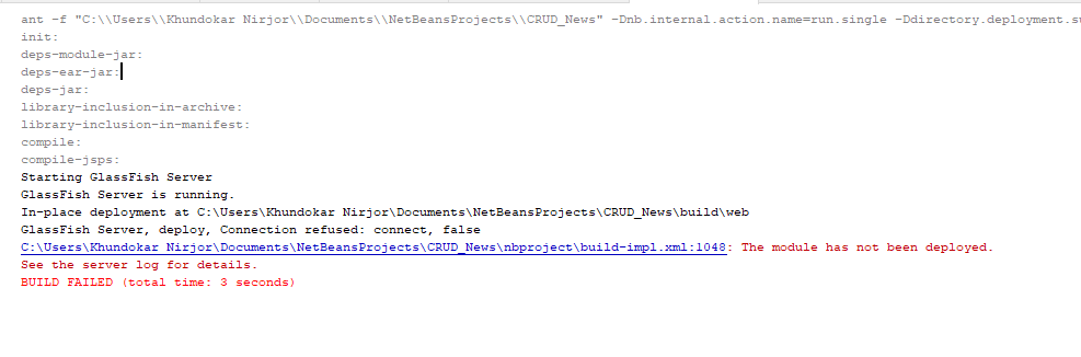 编译-jsp:启动GlassFish服务器GlassFish服务器正在运行。部署在C:\Users\Khundokar Nirjor\Documents\NetBeansProjects\CRUD_News\build\web服务器上,部署,连接拒绝:连接,假C:\Users\Khundokar Nirjor\Documents\NetBeansProjects\CRUD_News\nbproject\build-impl.xml:1048:模块尚未部署。有关详细信息,请参阅服务器日志。生成失败(总时间:3秒)