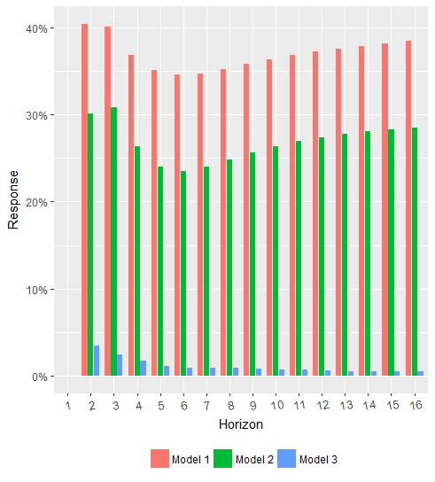 ggplot(Data, aes(as.factor(Horizon), Response,fill= Model)) +