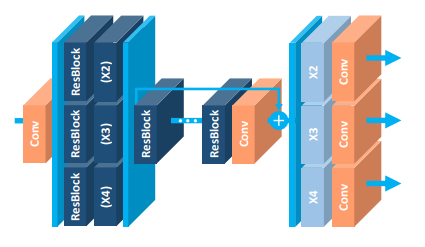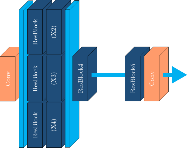 \node[block,right=0.2cm of resblock1](x1){\rotatebox{90}{(X4)}};