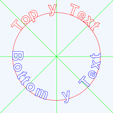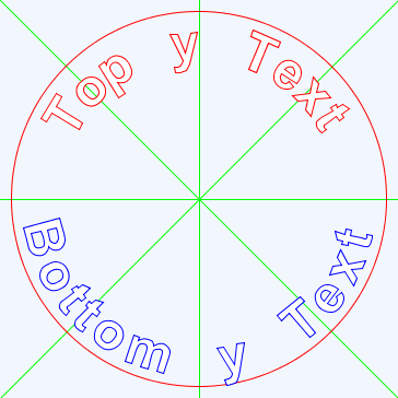 我希望画一个圆圈半径周围的概述文本,无论是在顶部和底部,与两个部分的文本面对正确的方式。