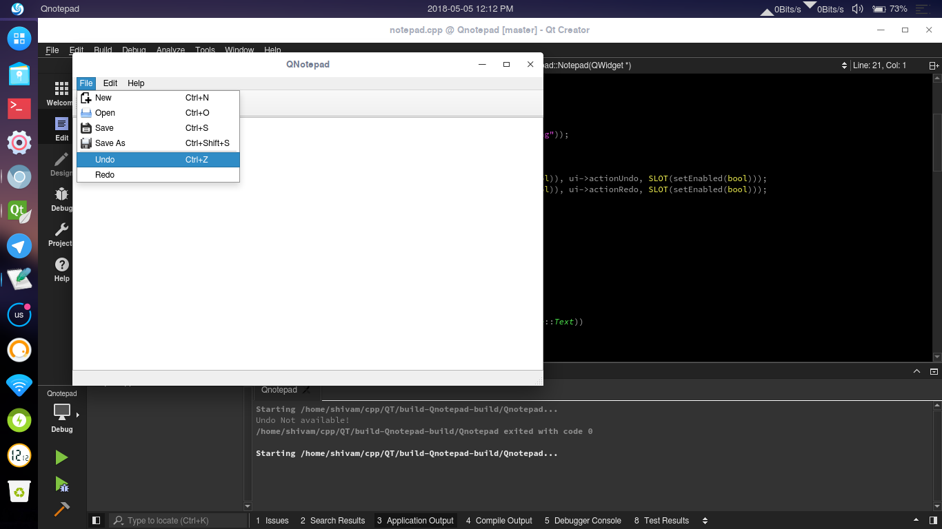 Qt元素(小部件、操作等)默认情况下启用,因此您需要取消选中notepad.ui文件Qt属性窗口中的Undo和Redo操作的启用标志。或者,您可以在窗口的构造函数中这样做: