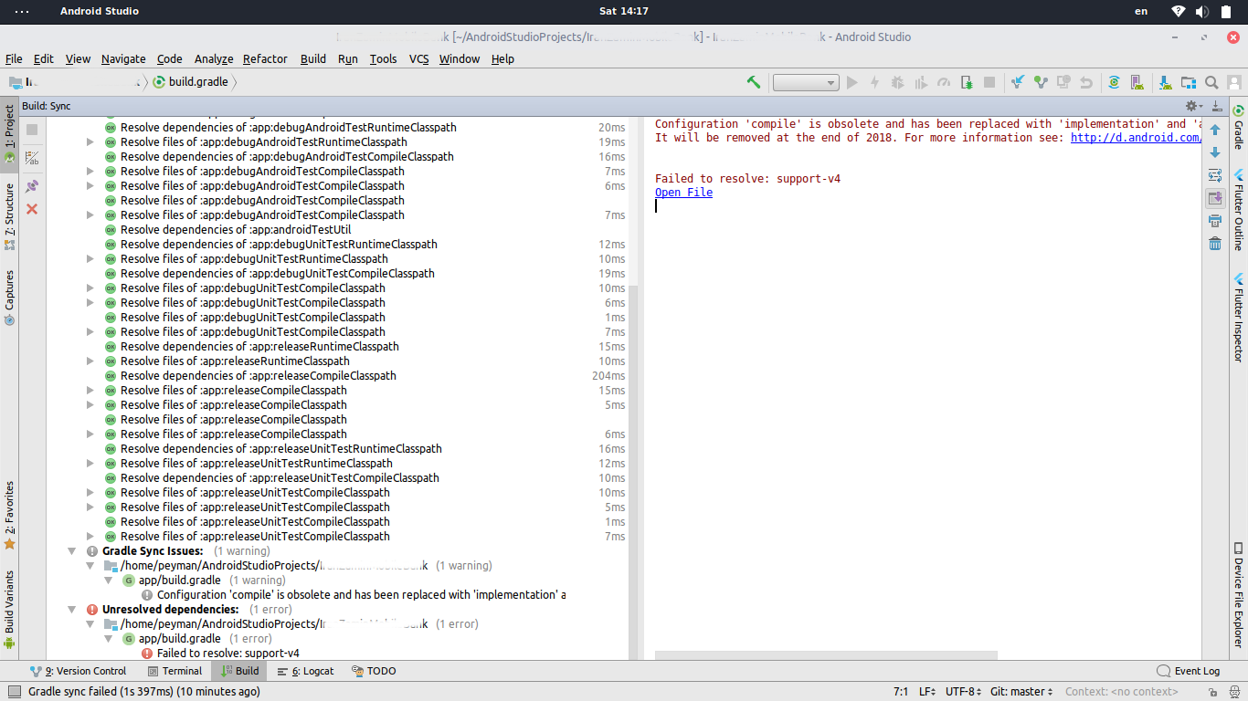 经过几天的努力,我终于找到了解决这个问题的办法。解决方案是删除caches文件夹中的~/.gradle并再次下载依赖项。