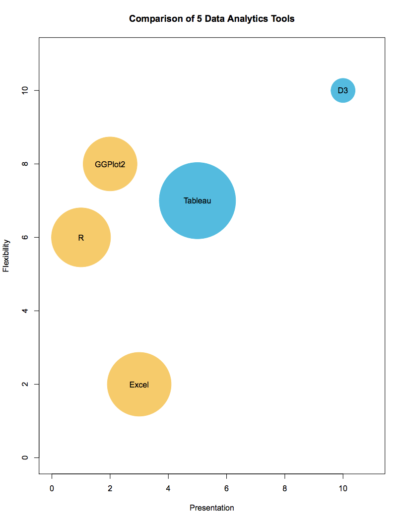 symbols(my_data_set$Analysis_Vs_Presentation, my_data_set$Flexibility, circles=sqrt(my_data_set$Easiness), inches=0.8, bg = IScolors[TypeLevels], fg="black", xlab="Presentation", ylab="Flexibility", main="Comparison of 5 Data Analytics Tools", xlim=c(0, 11), ylim=c(0, 11))