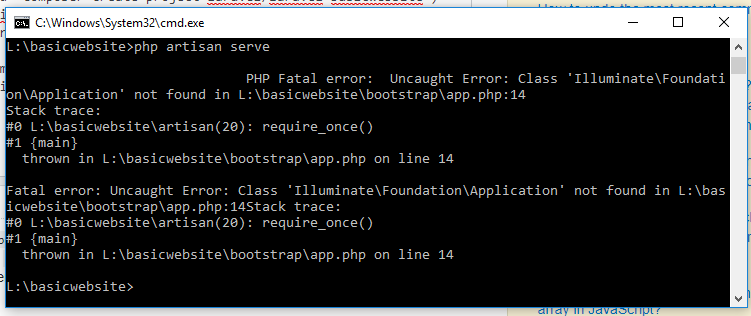 我已经创建(安装了composer create-project laravel/laravel basicwebsite)项目名为basicwebsite。然后运行php artisan serve,然后显示一些URL,然后在浏览器中得到LARAVEL页面,很好。(不小心,我的系统被关闭了。)要重新打开该项目,在cmd提示符中,我刚刚执行了