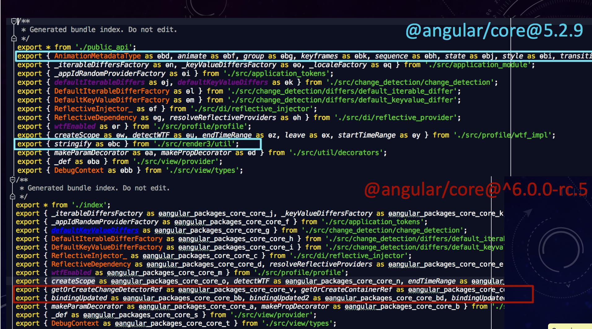 我比较了两个版本之间的两个@角/核心文件,并发现了一些更改(每个版本的颜色不同),您可以看到更新版本中缺少"AnimationEntryMetadata“: