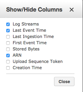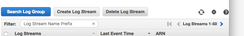 转到Cloudwatch日志,找到您的日志组,打开它,您将看到一个日志流列表。右上角有设置图标: