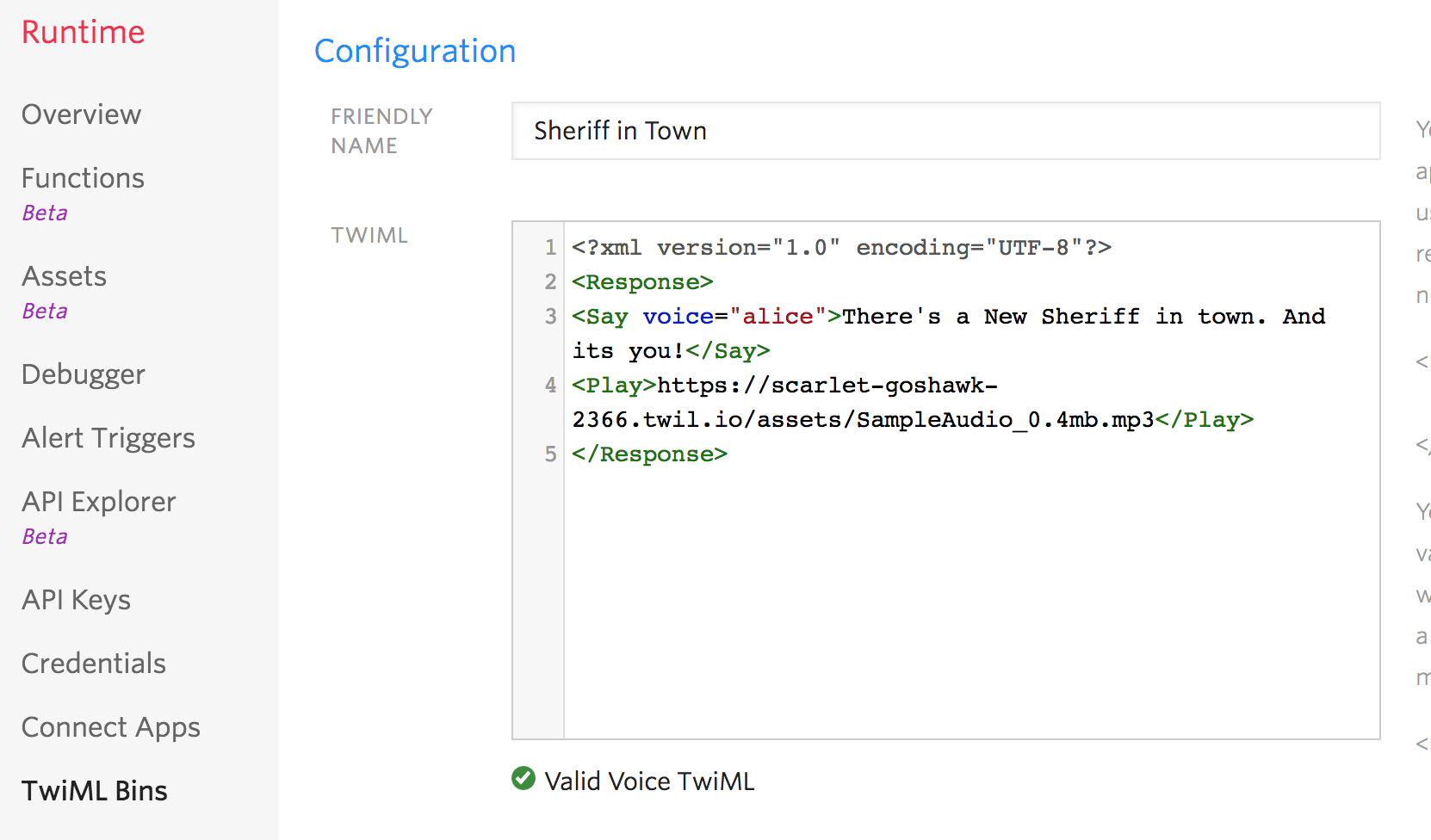 我试图通过在twilio TwiMl回收箱上托管一个xml文件并在资产中托管一个mp3文件来调用Twilio: