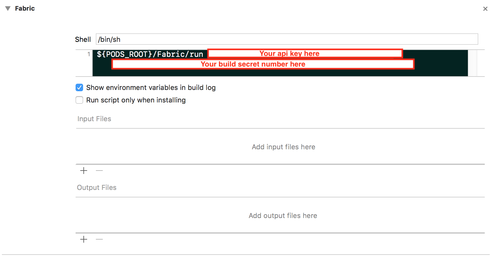 我正在尝试将织物安装到我的iOS应用程序中。我下载了Fabric应用程序来安装Crashlytics,但是当我在应用程序提供的构建阶段添加运行脚本时,在构建项目之后,我得到了错误: