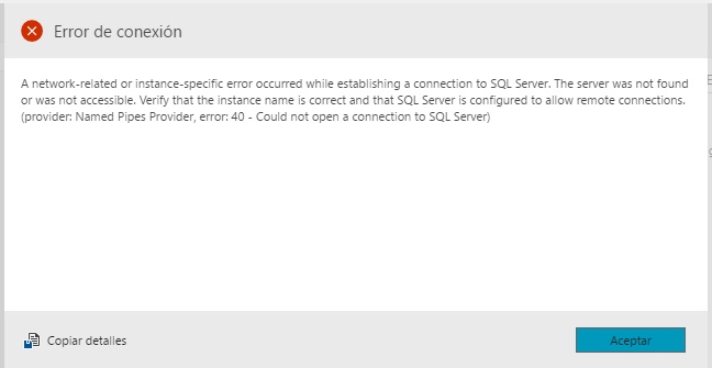 System.Data.SqlClient.SqlException (0x80131904): A network-related or instance-specific error occurred while establishing a connection to SQL Server. The server was not found or was not accessible. Verify that the instance name is correct and that SQL Server is configured to allow remote connections. (provider: Named Pipes Provider, error: 40 - Could not open a connection to SQL Server) ---> System.ComponentModel.Win32Exception (53): No se ha encontrado la ruta de acceso de la red