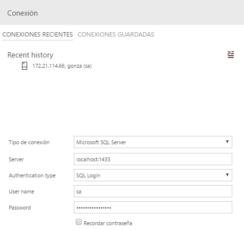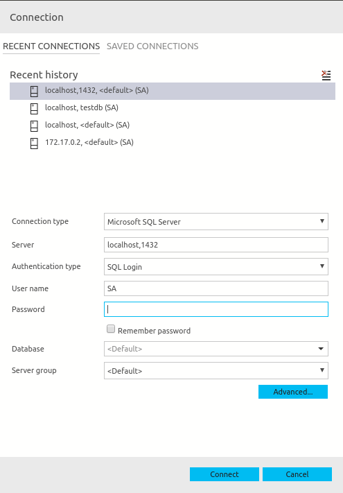 sqlserlinux_mssqllinux_1 /opt/mssql/bin/sqlservr Up 0.0.0.0:1433->1433/tcp连接: