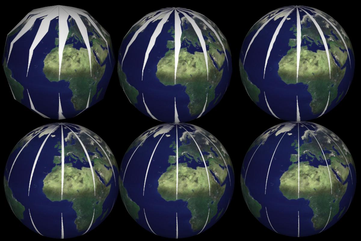在网格上显示的纹理应该具有最小的失真。为了避免扭曲的面积,距离和形状,我使用中断的正弦波地图投影而不是等长线投影。我使用在本站上找到的地球纹理进行测试。