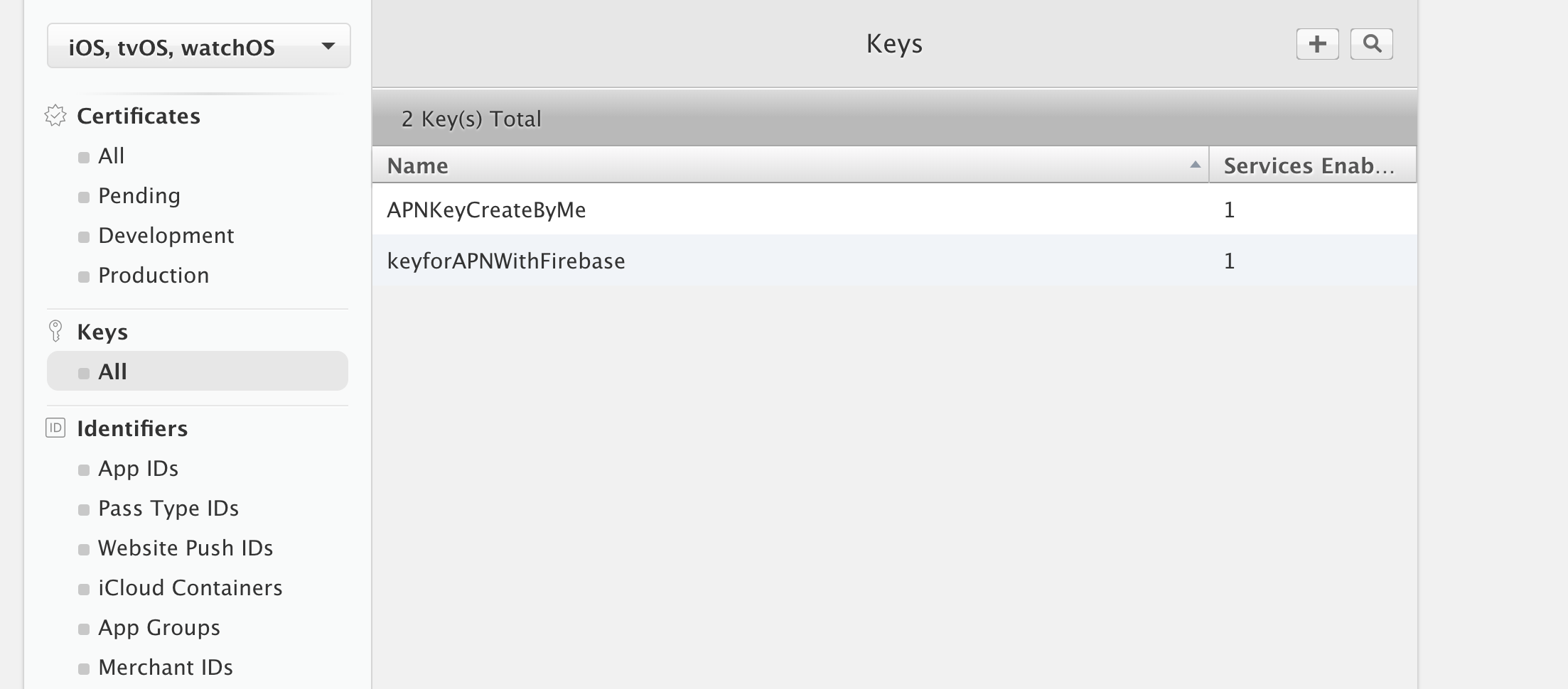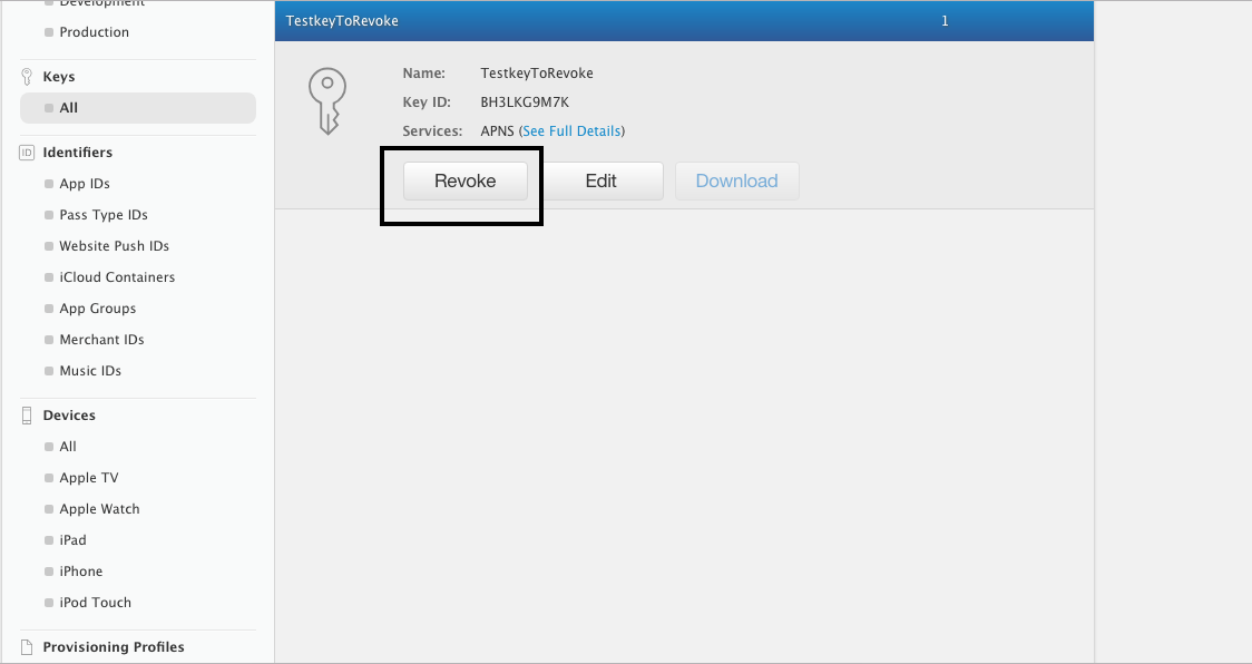 如果转到https://developer.apple.com/account/ios/authkey/,就会有一个+按钮来添加一个新键,但是一旦创建了.,就没有办法删除/撤销密钥了。