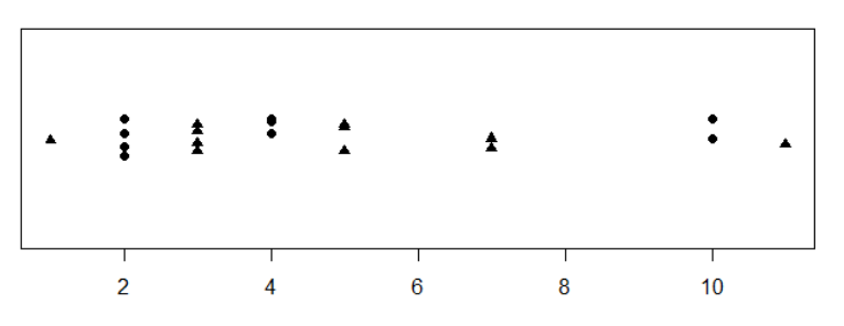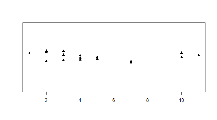 stripchart(x2, method = "jitter", pch = 17, add = TRUE)