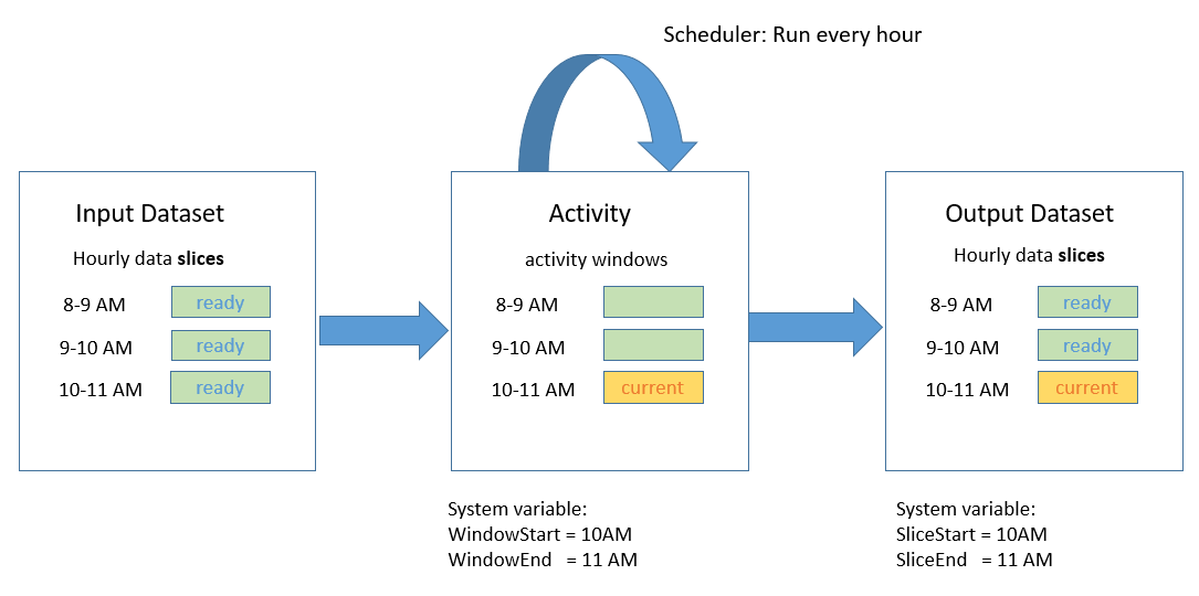 }活动运行所消耗或生成的每一个数据单元称为数据片。下图显示了一个具有一个输入数据集和一个输出数据集的活动的示例: