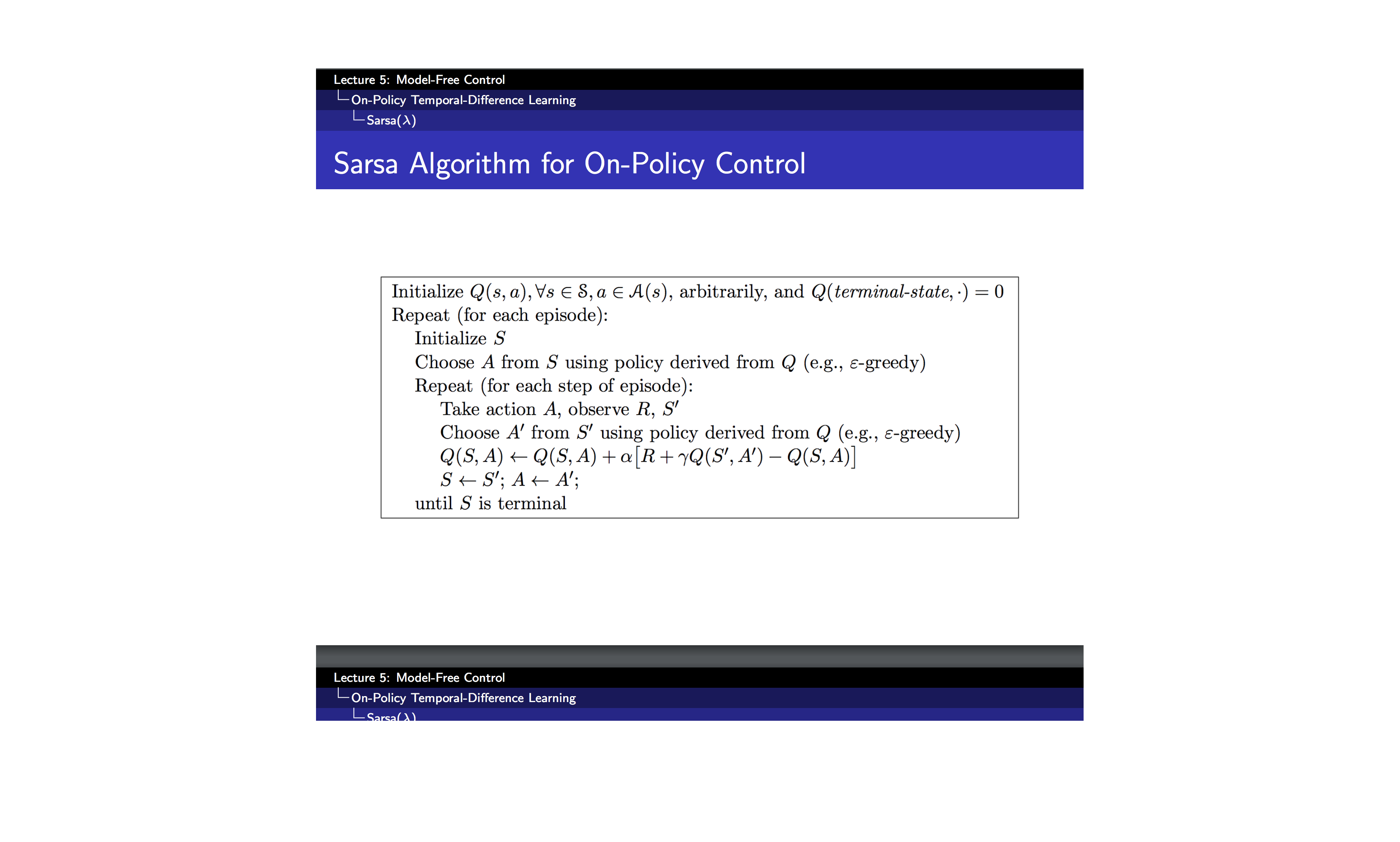 我在无模型强化学习中遇到了SARSA算法.具体来说,在每个状态中,您将采取一个操作a,然后观察一个新的状态s'。