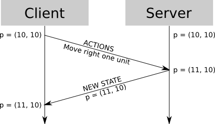 服务器向所有客户端广播两个带有时间戳的游戏状态。然后,每个客户端在状态n和n+1之间插入。在此期间,任何用户输入都被发送回服务器,然后服务器被合并到状态n+1和n+2中,这些状态在下一次广播中被发送。当客户端在插值中到达n+1时,用新的n+1和n+2对n+1进行校正。