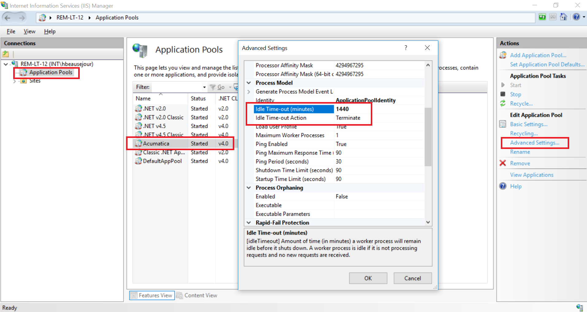 如果您是托管的前提,您可以更改这些设置在IIS (inetmgr.exe).选择用于Acumatica实例的AppPool,进入高级设置和位置空闲超时选项: