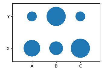# Y 0.1 0.4 0.1我不能使用matplotlib.scatter,因为它不接受分类输入,创建假值也不起作用,因为它不是n*n,或者我可以吗?我搞不懂。我发现了seaborn.stripplot,它接受一个明确的输入,但是所有气泡的大小都是一样的,所以我被卡住了。