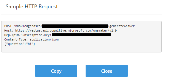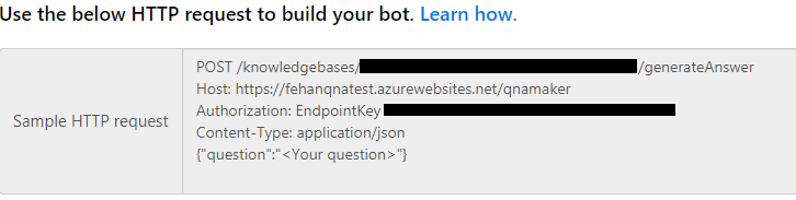 在发布您的知识库之后,您将找到可在应用程序或bot代码中使用的端点详细信息。正如菲尔提到的,它使用一个蔚蓝网站作为其generateAnswer端点,这与旧版本的QnA服务不同。