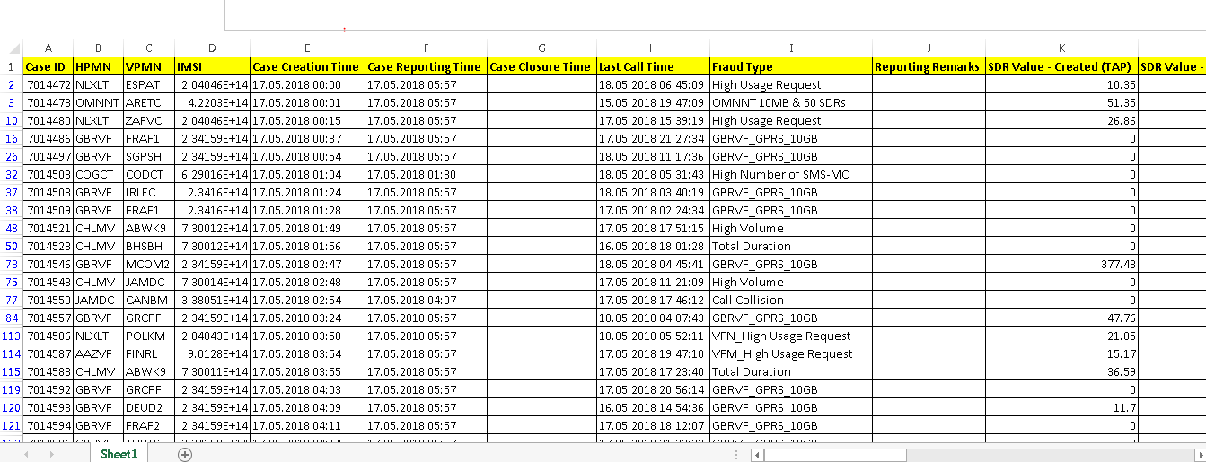 | CASE_ID | HPMN | VPMN | IMSI | CASE_CREATION_TIME | CASE_REPORTING_TIME | CASE_CLOSURE_TIME | LAST_CALL_TIME | FRAUD_TYPE | REPORTING_REMARKS | SDR_VALUE_CREATED_TAP | SDR_VALUE_CREATED_NRT | SDR_VALUE_REPORTED_TAP | SDR_VALUE_REPORTED_NRT | SDR_VALUE_CLOSED_TAP | SDR_VALUE_CLOSED_NRT |