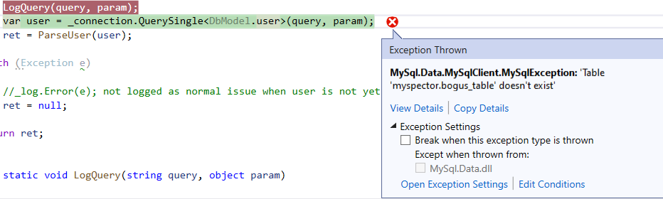 MySql.Data.MySqlClient.MySqlException: 'Table 'myspector.bogus_table' doesn't exist'您可能处于调试模式,启用了所有异常。当此异常引发时,请取消选中“抛出此异常时的中断”,如下所示:
