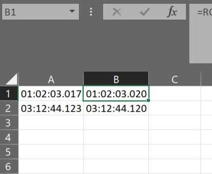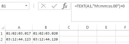 我有一些时间数据,如果没有VBA,我需要舍入到最近的10毫秒。例如: