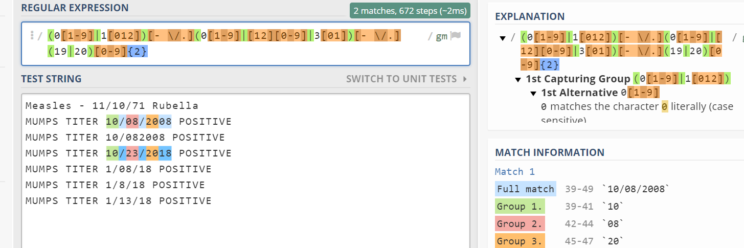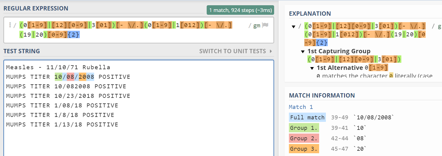 943729 Barnes, B 10/10/1965 MMR1 MUMPS MUMPS TITER 10/08/2008 POSITIVE分隔将日期与后续文本分开,这很好,但是如果在日期之前出现文本,则输出包含文本的第一部分。我只想从字符串中获取日期(如果存在的话)并显示它,而不管它在字符串中的位置。下面是示例结果:E列是拆分逻辑的输出,F列是从其他工作表计算的整个字符串。