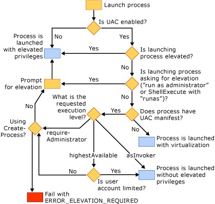 下面的流程图描述应用程序将如何运行取决于是否启用了UAC和应用程序是否具有UAC清单。