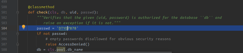 passwd = '<MY_ADMIN_USER_PASSWORD' if not passwd: # empty passwords disallowed for obvious security reasons raise AccessDenied()如果函数在这个硬代码中失败了,我就修复了这个问题。