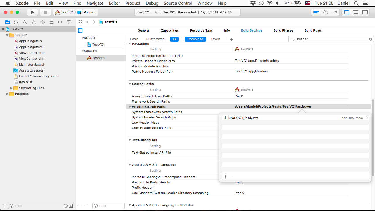 Xcode试图通过“搜索路径”列表查找头文件(.h)。您可以在这个列表中有多个搜索路径,例如,如果程序中有#import <a.h>,而搜索路径列表中有路径"/asd“和"/qwe”,它将尝试找到标题为"/asd/a.h“或"/qwe/a.h”(两者都会尝试)。
