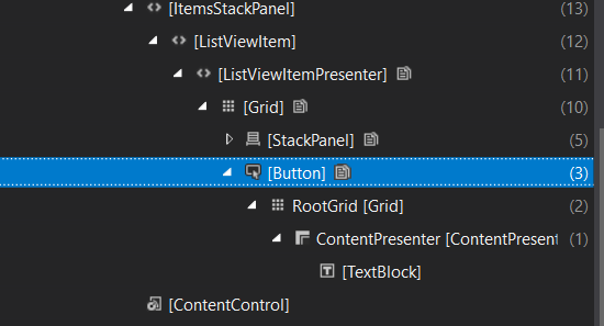 我有一个ContentDialog,它有一个ListView。这个ListView's DataTemplate包含一个Grid,而这个Grid有一个Button。代码是这样的: