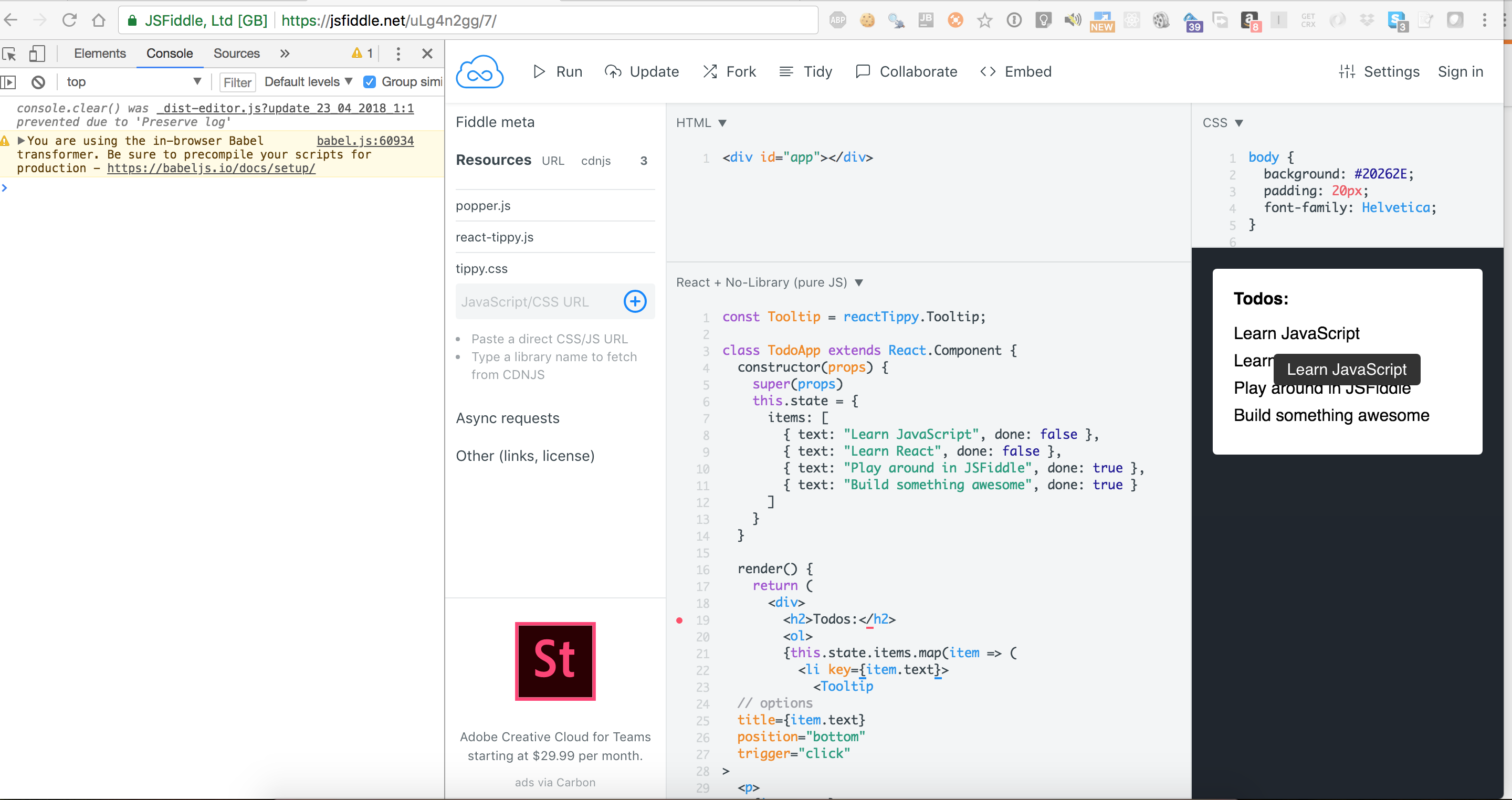 两期。您正在加载UMD模块的reactTippy。因此,该模块没有在全局范围内加载Tooltip。因此,您需要在JSFiddle顶部添加以下内容