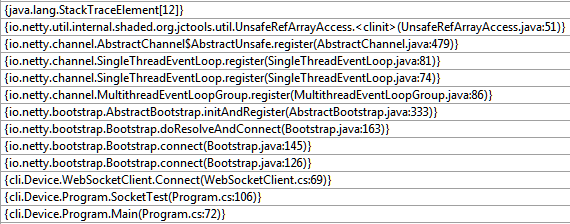 我写了一个小小的控制台应用程序,它应该像一个带有Netty客户端的IOT设备。我使用我生成的DLL来编写一个客户端。我试图连接时出了一个错误,并假设由于没有代理,所以它只是找不到端点。所以今天我写了服务器代码。一旦我完成,我试图再次连接设备,并得到了同样的错误。