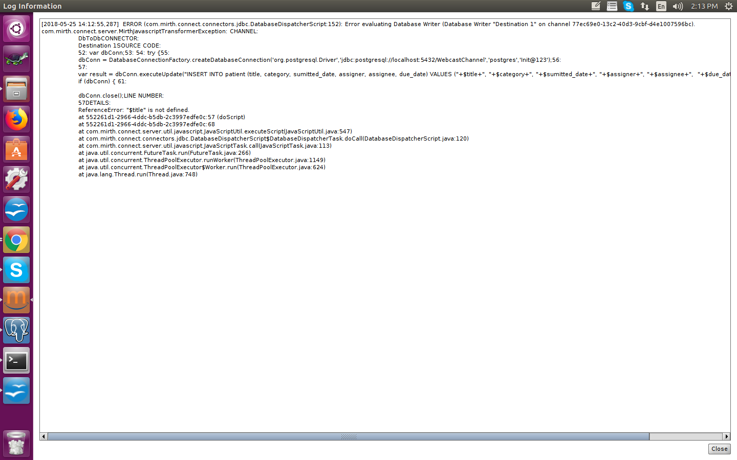 Mirth抱怨在Javascript中使用了未定义的$title变量。看起来您正在尝试打开到postgres数据库的JDBC连接并执行一些插入,但是您引用的数据(例如$title)不是Mirth的通道映射的一部分。
