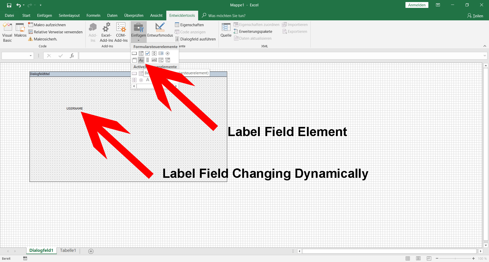 如何在Excel中动态地输入Label字段?我想要的是,当我打开excel文件时,我的用户名将显示在动态标签字段中。在Excel5.0对话框上。